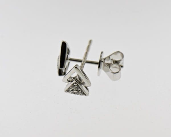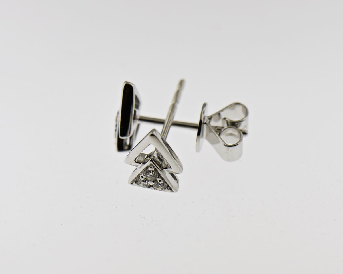 These earrings are our modern take on Diamond stud earrings. Instead of one larger center Diamond, these earrings use geometric white gold set with smaller Diamond accents to create a larger presence on the ear, with an interesting modern edge, while still providing sparkle. The earrings measure just over a quarter inch long, so are an ideal size for everyday wear. Wear them point up, point down, or any way in between.
