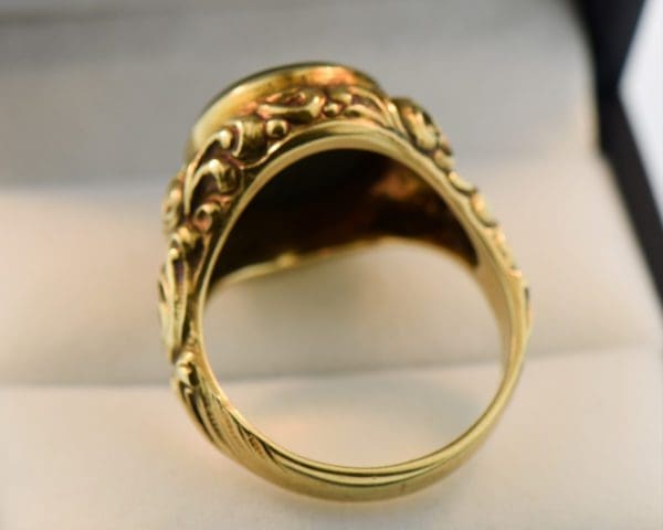 Originally designed as a man’s ring we believe that today, this antique signet ring could be worn by anyone. Cast in rich 14k yellow gold sometime in the 1940’s, this ring has a timeless design- we have seen examples like it for generations. The top of the signet ring is a tablet of Bloodstone, a deep green stone with microscopic red flecks. Leave it as is, or have a gemstone carver engrave your family crest in the middle! The surrounding mounting features chased repousse work, where the goldsmith pushed the mounting from behind to provide intricate neoclassical scroll work. This ring just screams classic elegance with its impressive size and architectural look.