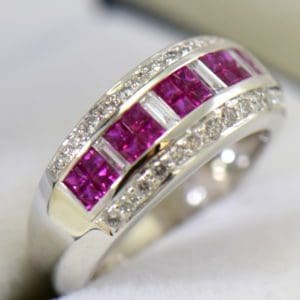 This ring is a version of our favorite Art Deco inspired ring mount, designed for a round center stone, then encrusted with Diamonds and set with a fabulous Ruby. The white gold ring is further detailed with milgrain work around the bezels, on the edges, and around the hand carved shank- just like a ring from 1925. The center Ruby is a natural gem of beautiful stoplight red color. With Rubies, it is all about the color- some minor inclusions are expected and proof of natural origin so long as they don’t detract from the gem. This Ruby is not the pink, opaque, or lab created stone most clients are used to; no, it is a rich and regal gem that jumps off the hand and makes a big impression. The photos cannot do this Ruby justice, as red is the hardest color to capture on camera, so we have attempted to show it under various lighting conditions. This red gem would look great with other Art Deco pieces, but could also be worn as a standalone piece as a Ruby engagement ring, July birthstone ring, etc.