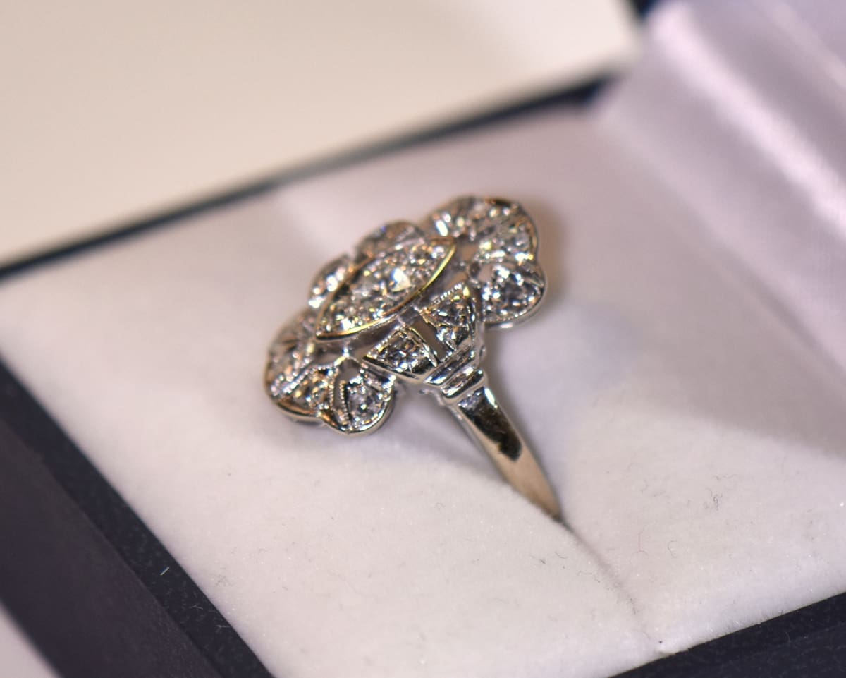 This wonderful survivor is an example of the rings we see from the late Art Deco period, circa 1935. In the 1930s, the Depression decreased American consumer’s budgets for Diamond rings, so jewelers crafted designs with bold looks using smaller Diamonds. In addition, the advent of 14k white gold decreased production cost relative to 18k or platinum. While this ring was designed to be more affordable, the jeweler did not sacrifice quality- the ring was artfully designed and cast in heavy white gold, then set with a generous amount of fine quality single cut and modern European brilliant cut Diamonds. This ring is similar to earlier Deco ‘dinner rings’ in that it has a strong knuckle-to-knuckle presence and some filigree accents, but it has a more simple design and less angular motif- a sign of the Retro pieces that were coming by the end of the 1930s. A find for a diamond ring lover, or Art Deco collector.