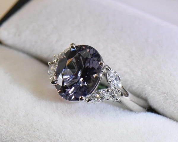 Details: 900 platinum ring set with natural 2.94ct oval color shift blue-violet Spinel (Sri Lanka, untreated) and .37ctw round & marquise Diamond accents (VS2 GH).