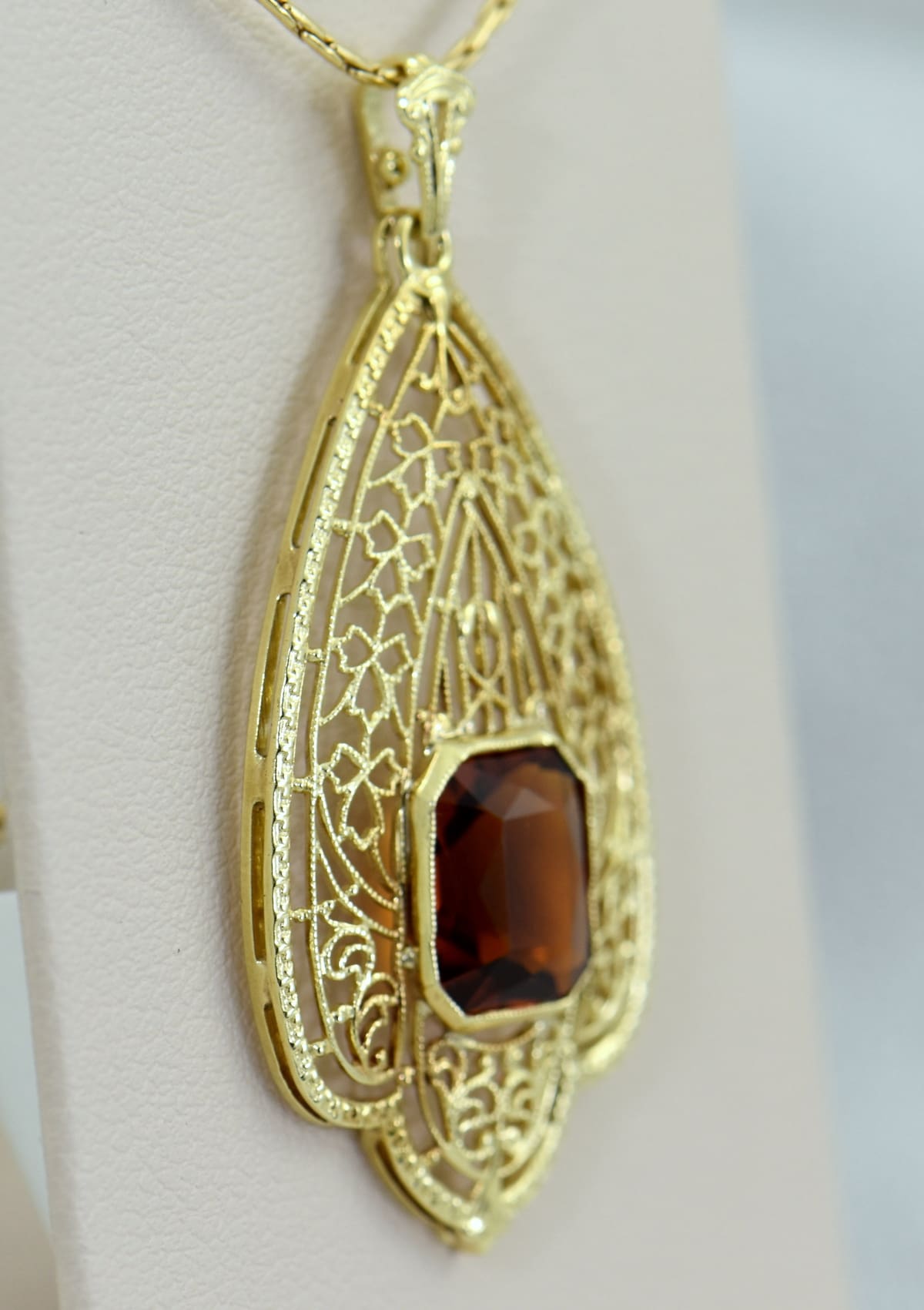 Details: 14k yellow pendant with approximately 2.00ct radiant cut Madeira Citrine and hand-carved filigree, circa 1925.