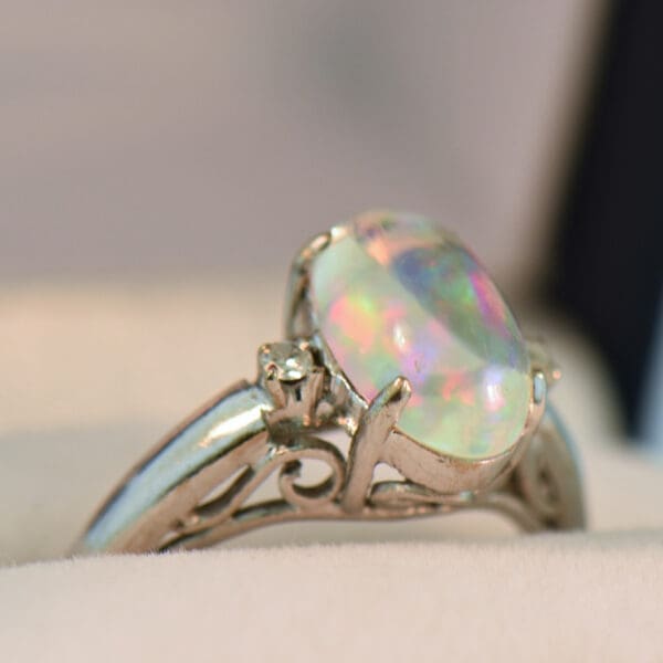 In Spanish, “contra luz” means “against the light.” The term contra luz is used to refer to Mexican Jelly Opals with a particular type of fire, or play of color, such as the gem in this ring. As with most of the type, this Opal has been cut into a high dome cabochon which allows the gem to capture the light. As the gem moves, the crystal structure of the Opal interferes with the light, breaking it into its prismatic colors. It comes alive with a kaleidoscope of pastel blue, green, red, and more. At some angles the Opal has a milky, moonstone-like glow, at others you can see every color of the rainbow; this is contra luz jelly Opal, and it is only mined in Mexico. This Mexican Opal is set into an estate 3-stone white gold ring mounting with dainty Diamond accents, by way of Japan, where rare gemstones are highly prized. If you’ve been looking for an unusual Opal, look no further.