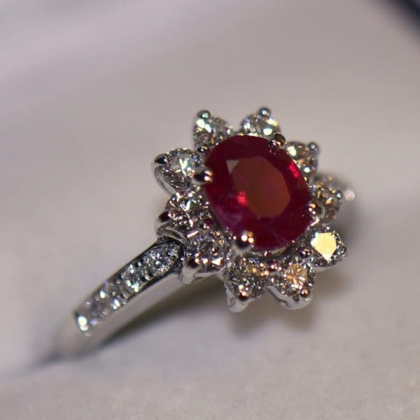 Details: 18k white gold ring set with 1.41ct oval Ruby (natural, heat only) and .76ctw round natural Diamond accents (SI1 GH), from Japan c.1990s.