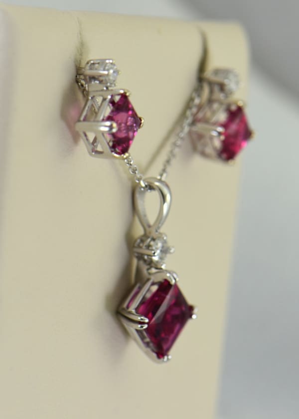 Details: 14k white gold earrings with 1.38ctw princess cut Rubellite and .14ct Diamonds, 14k white gold pendant with 1.72ct princess cut Rubellite and .12ct Diamond (I1 GH).