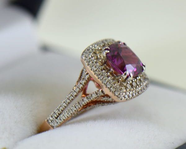 Details: 14k rose gold ring set with 1.83ct Purple Rhodolite Garnet (Mozambique, untreated) and .70ctw Diamond accents: .20ctw Champagne SI diamonds, .50ctw SI GH white Diamonds.