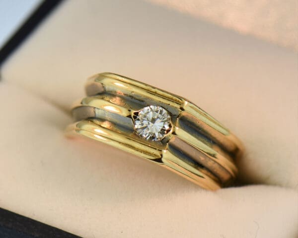 Details: estate gents pinky ring in 14k yellow gold flush-set with .35ct round natural Diamond (VS2 clarity, IJ color) with black rhodium accents in low areas of the band; circa 1970.